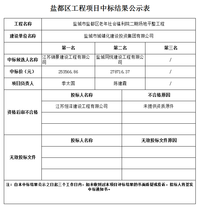 鹽城市鹽都區(qū)老年社會(huì)福利院二期場地平整工程中標(biāo)結(jié)果公示