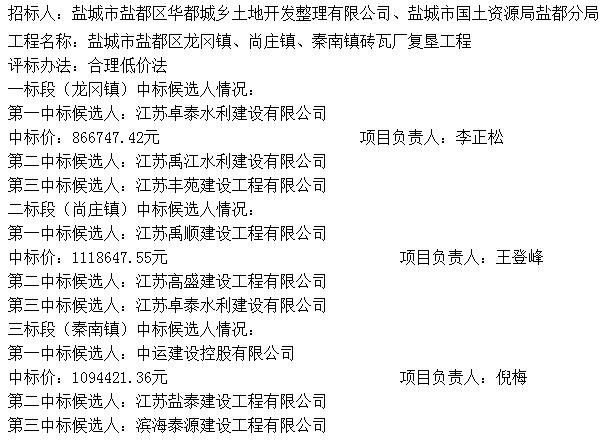 鹽城市鹽都區(qū)龍岡鎮(zhèn)、尚莊鎮(zhèn)、秦南鎮(zhèn)磚瓦廠復(fù)墾工程中標(biāo)公示
