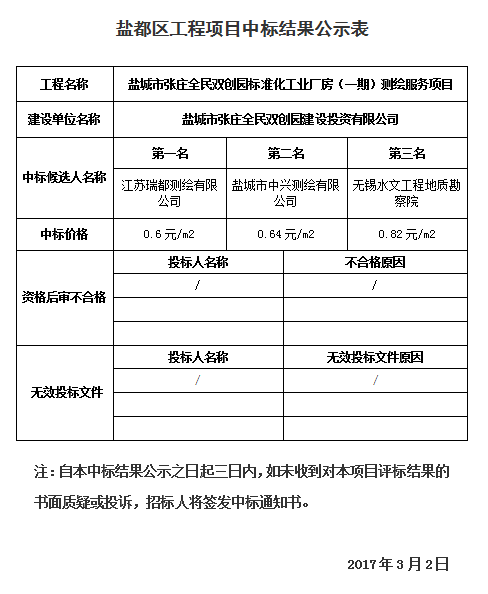 鹽城市張莊全民雙創(chuàng)園標(biāo)準(zhǔn)化工業(yè)廠房(一期)測繪服務(wù)項(xiàng)目中標(biāo)公示